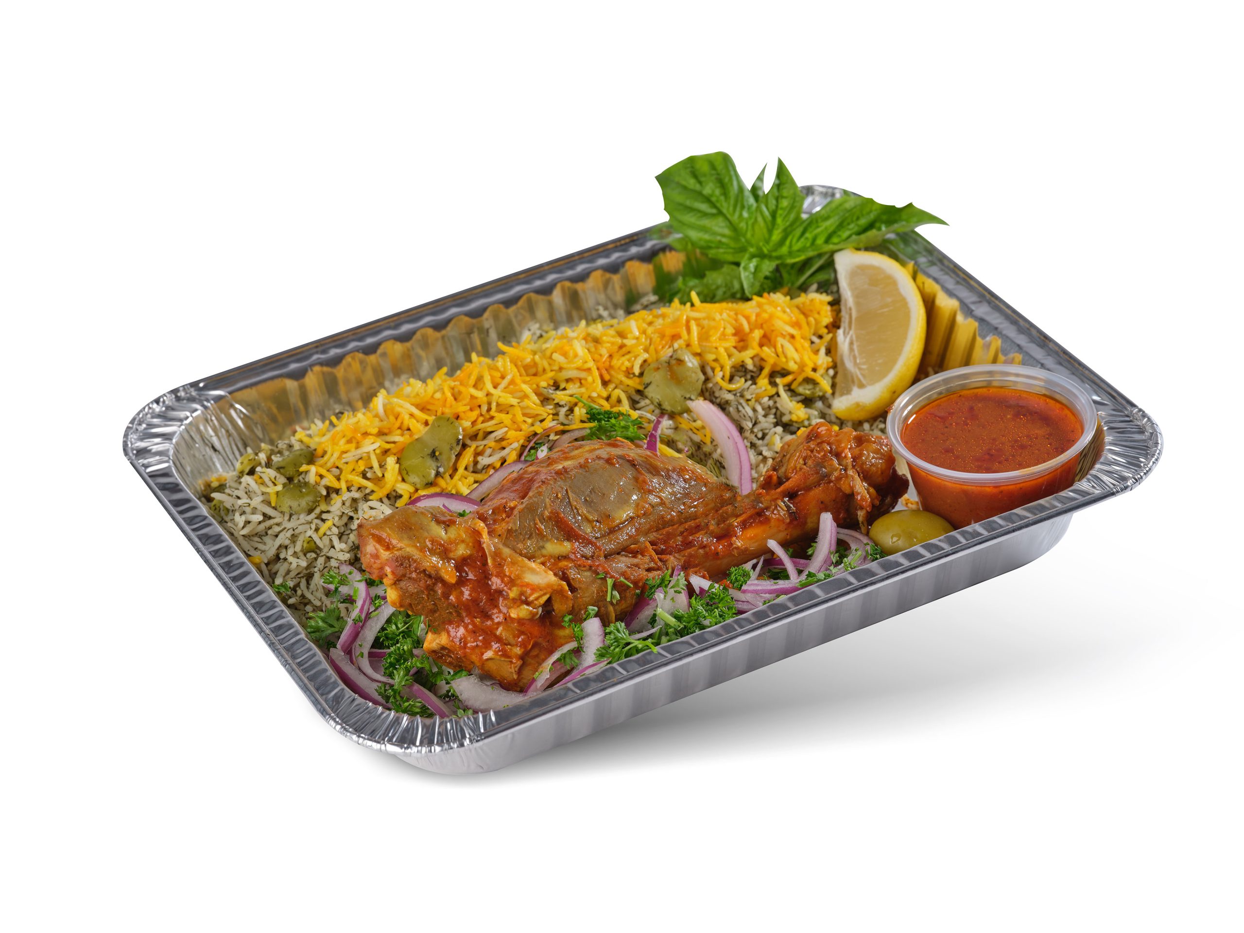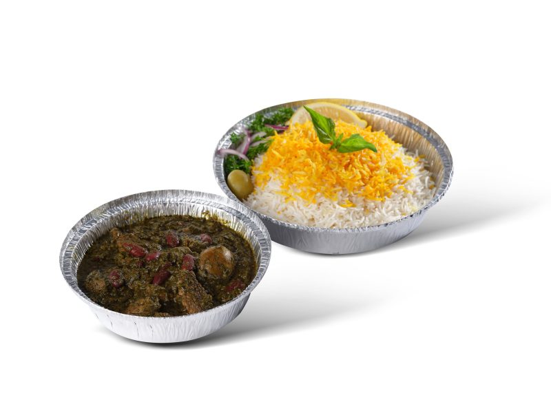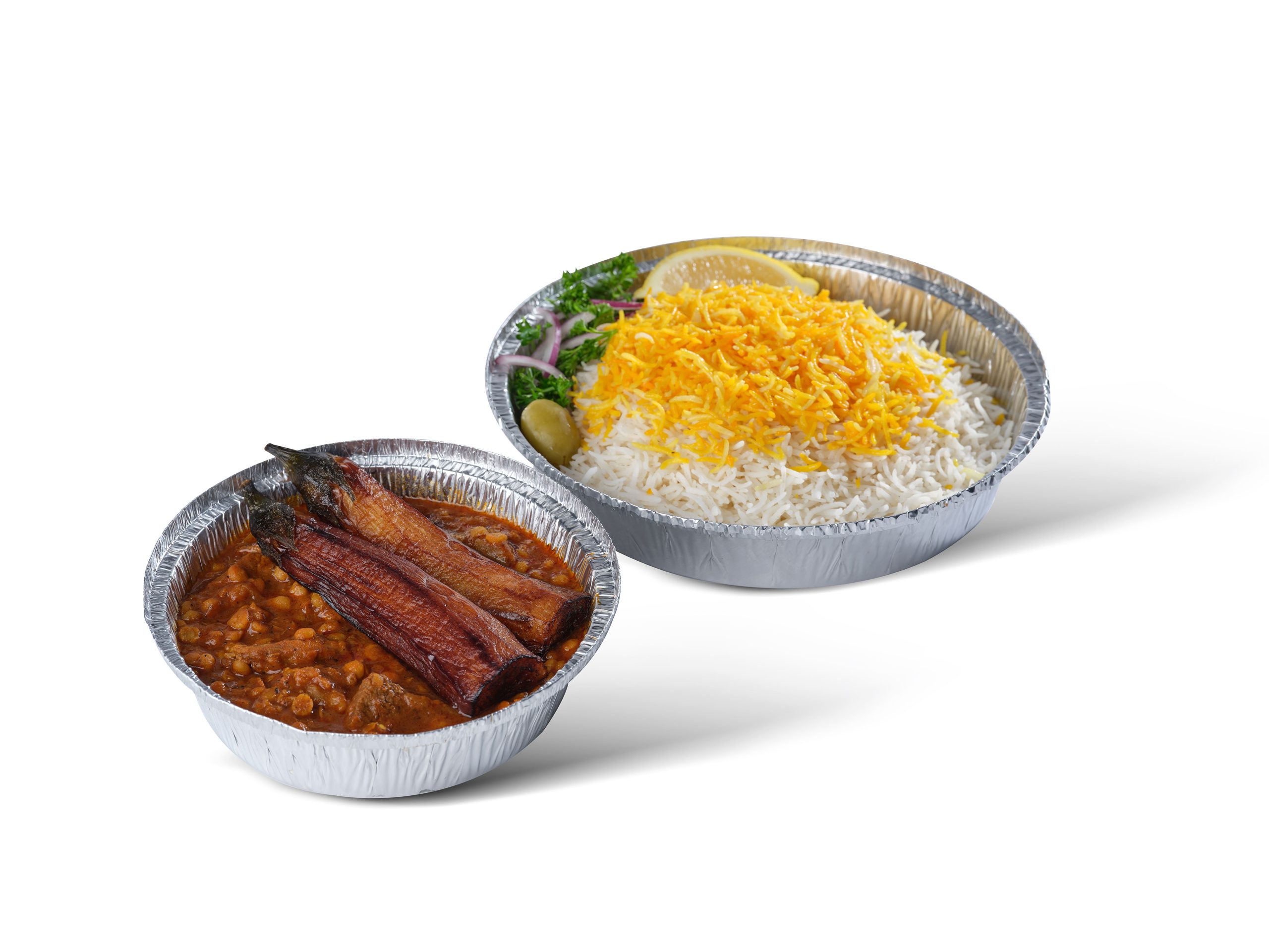 Mixture of beef pieces-split peas-dried lime fried eggplant served with saffron rice