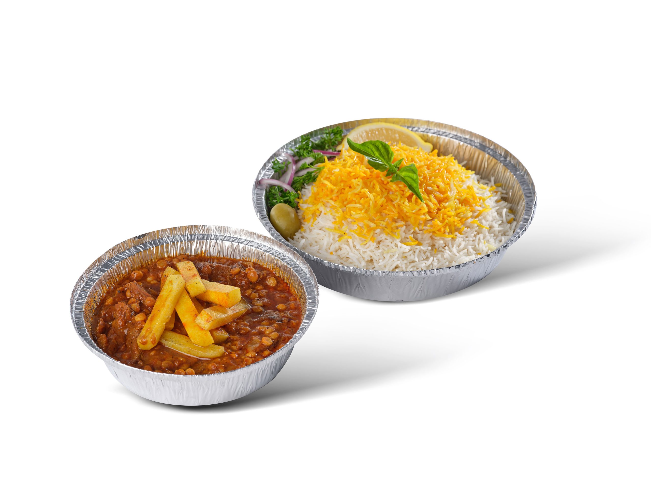 Mixture of beef pieces-split peas-dried lime potato served with saffron rice